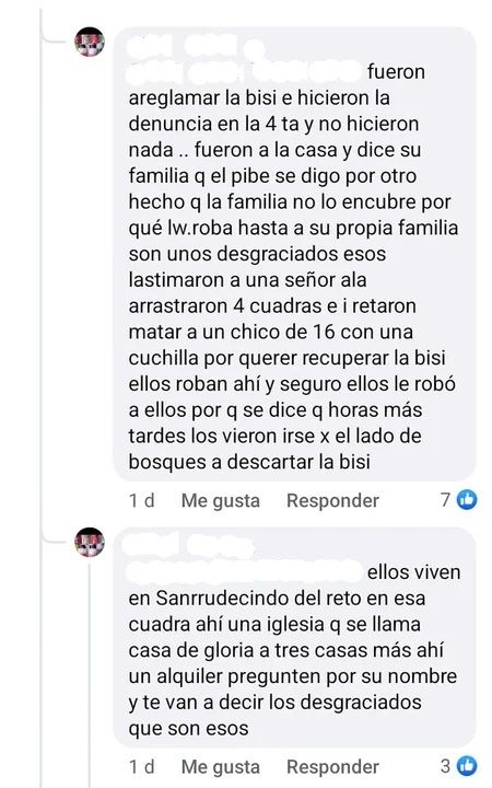 "Fueron a reclamar la bici e hicieron la denuncia en la comisaría 4ta. Fueron a la casa y dice su familia que no lo encubre porque hasta a ellos les roba. Esos son unos desgraciados. Lastimaron a una señora. La arrastraron cuatro cuadras e intentaron matar a un chico de 16 años con una cuchilla por querer recuperar la bici", agregó.