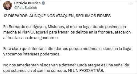 La ministra de Seguridad de la Nación, Patricia Bullrich, a través de su cuenta de X, hizo referencia al ataque y posteó: “12 DISPAROS: AUNQUE NOS ATAQUEN, SEGUIMOS FIRMES”.