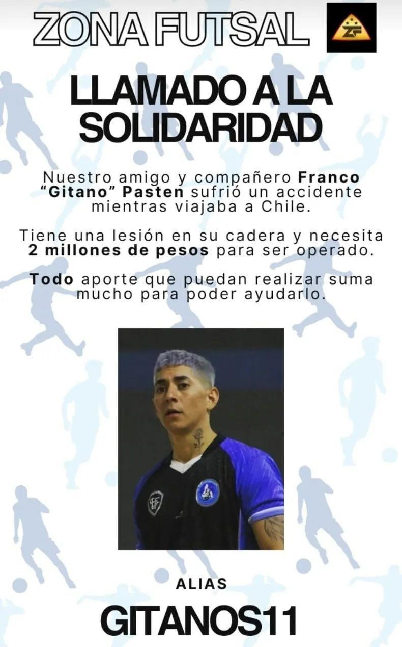 Franco Pastén es jugador de futsal del Club Huarpes y quedó gravemente herido. Producto del impacto, Pastén quedó atrapado debajo del chasis del auto y fue retirado rápidamente por los propios conductores. El sanjuanino sufrió una lesión, por lo que piden ayuda para los gastos médicos.
