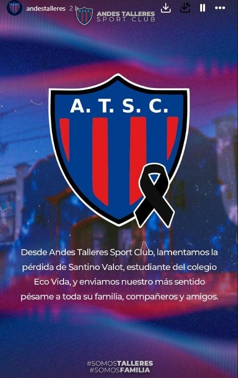 Luego difundió un comunicado oficial en el que expresaron: "Desde Andes Talleres Sports Club lamentamos la pérdida de Santino Valot, estudiante del colegio Eco Vida, y enviamos nuestro más sentido pésame a toda su familia, compañeros y amigos".