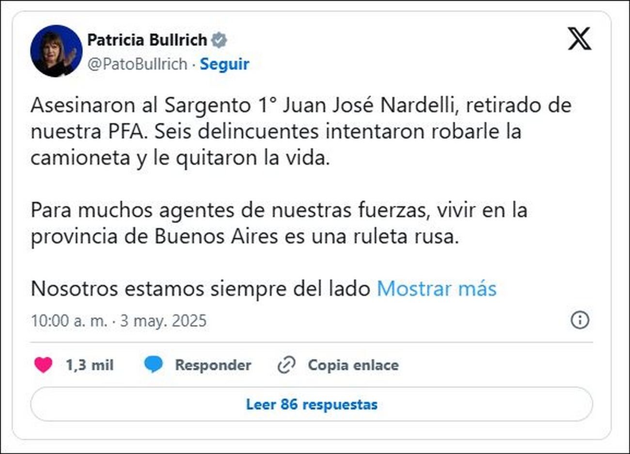 La ministra de Seguridad, Patricia Bullrich, se manifestó al respecto en sus redes sociales. “Asesinaron al Sargento 1° Juan José Nardelli, retirado de nuestra PFA. Seis delincuentes intentaron robarle la camioneta y le quitaron la vida. Para muchos agentes, vivir en Buenos Aires es una ruleta rusa”, escribió en su cuenta de X.