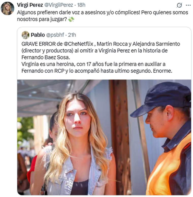 “GRAVE ERROR de @CheNetflix, Martin Rocca y Alejandra Sarmiento (director y productora) al omitir a Virginia Perez en la historia de Fernando Baez Sosa”, dice el posteo. Y continua: “Virginia es una heroína, con 17 años fue la primera en auxiliar a Fernando con RCP y lo acompañó hasta último segundo. Enorme”.