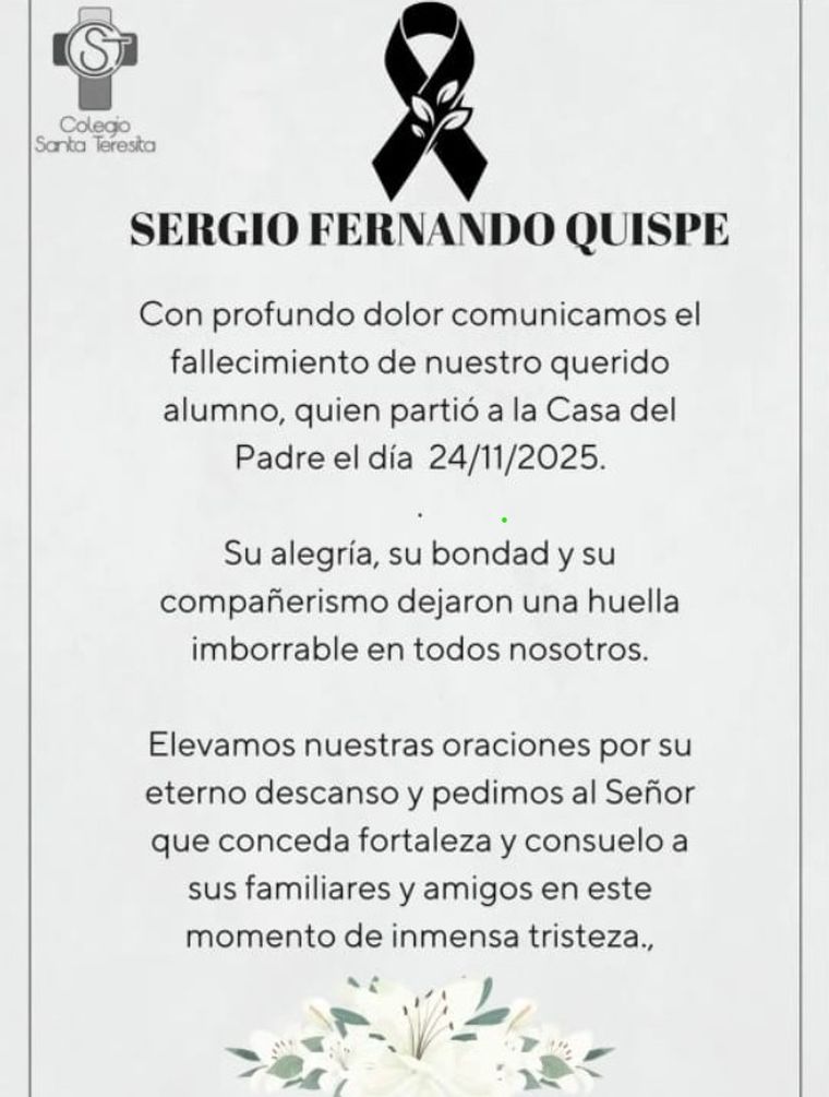 Una vez se confirmó el deceso de Quispe, la escuela a la que asistía, el Colegio Santa Teresita, publicó un mensaje lamentando la noticia: "Con profundo dolor comunicamos el fallecimiento de nuestro querido alumno, quien partió a la Casa del Padre".