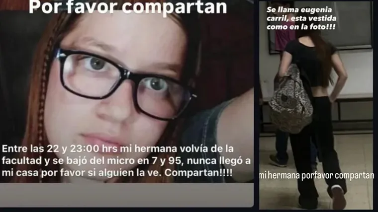 La víctima, identificada como Eugenia Carril, era buscada con desesperación por su familia desde la noche anterior. Había salido de la facultad y debía regresar a su casa, pero nunca llegó. Ante la falta de noticias, sus allegados iniciaron una intensa búsqueda y difundieron su foto en redes sociales.