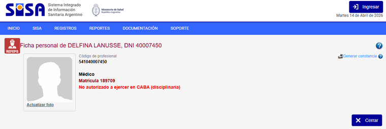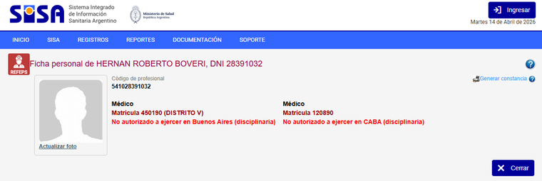 La inhabilitación se vio reflejada en el Sistema Integrado de Información Sanitaria Argentino este martes, en la que se vio un cambio en el estado de Boveri, en el que ya no está autorizado a ejercer ni en la provincia de Buenos Aires o en la Ciudad.
