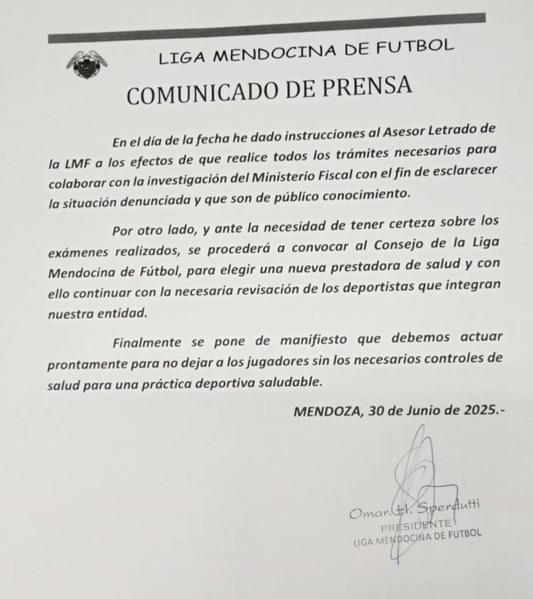Durante la tarde de este lunes, la Liga Mendocina de Fútbol difundió un comunicado oficial en el que expresó su intención de colaborar con la investigación judicial. Según lo informado, el presidente Omar Sperdutti instruyó al Asesor Letrado del organismo para que realice todos los trámites necesarios ante el Ministerio Público Fiscal.