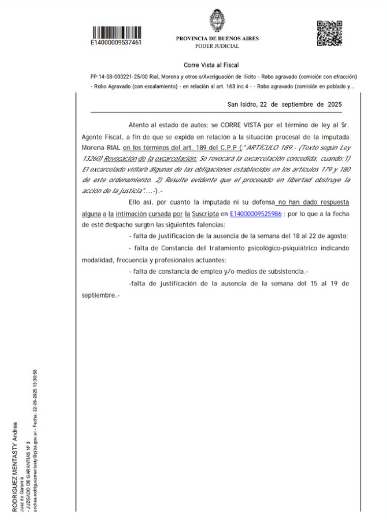 Según la Justicia, la hija del periodista Jorge Rial no habría justificado su ausencia entre la semana del 18 al 22 de agosto; tampoco presentó constancia sobre el tratamiento psicológico-psiquiátrico —indicando modalidad, frecuencia y profesionales actuantes— ni documentación que acredite empleo o medios de subsistencia. Además, no habría justificado su ausencia durante la semana del 15 al 19 de septiembre.