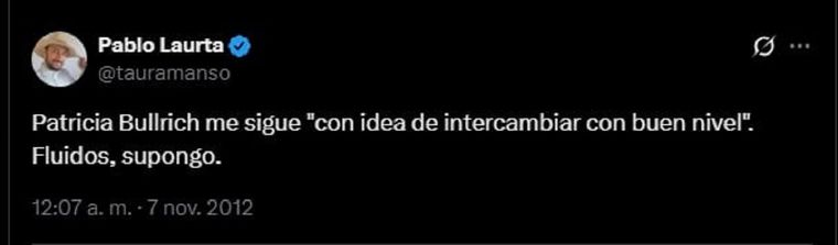 En su cuenta de X, Laurta llegó incluso a escribir comentarios ofensivos hacia mujeres, entre ellos uno dirigido a Patricia Bullrich en 2012: “Patricia Bullrich me sigue ‘con idea de intercambiar con buen nivel’. Fluidos, supongo”, publicó entonces.