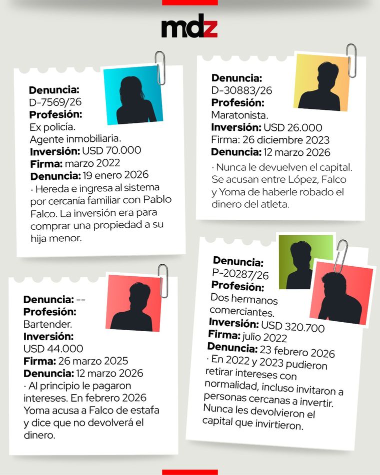 A comienzos del año siguiente, los hermanos le pidieron a Falco hacer un retiro de 50.000 dólares, explicándole que necesitaban el dinero en el corto plazo. El socio de Yoma les respondió que "se podía ver", pero ese pago nunca se concretó. Es más, en marzo de 2025, desde la financiera evitaban contestarles y buscaban avanzar con un plan de pago.