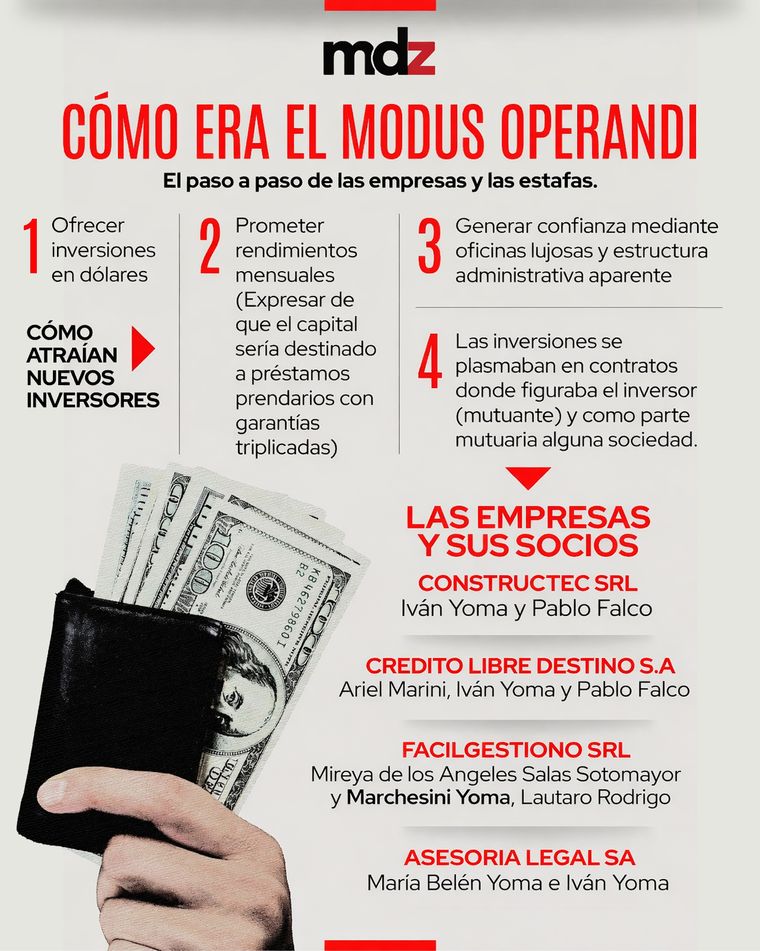 En todos los casos, las víctimas relataron que, por medio de conocidos o personas de su círculo íntimo, tomaban conocimiento sobre la posibilidad de inversión "supuestamente infalible" que ofrecían Yoma y sus socios a través de la financiera Asesoría Legal S.A., que operaba en calle 25 de Mayo al 1200 de la Ciudad de Mendoza.