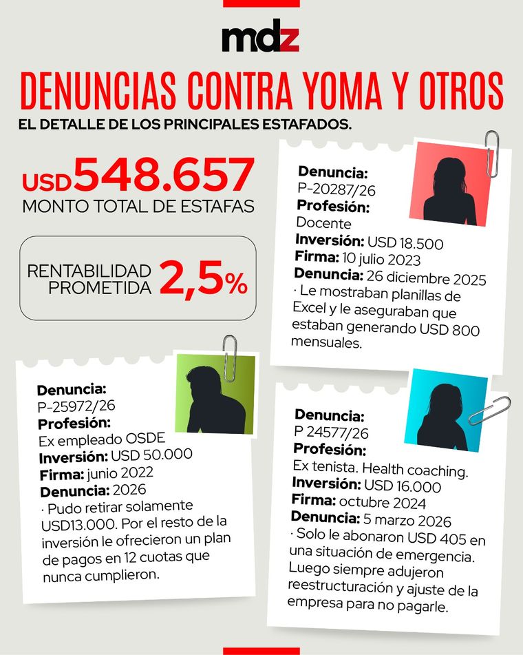 Hasta la tarde de este martes, de los siete expedientes que se acumularon en Delitos Económicos e Informáticos surgía que esas víctimas entregaron un total de 548.657 dólares, es decir, casi 800 millones de pesos argentinos. En la mayoría de los casos, se trataba de ahorros de toda la vida o dinero generado por el trabajo de diferentes generaciones de una misma familia, que se perdieron a partir de las maniobras fraudulentas de la organización liderada por Yoma y sus socios, tal como surge de las presentaciones que analiza la Justicia.