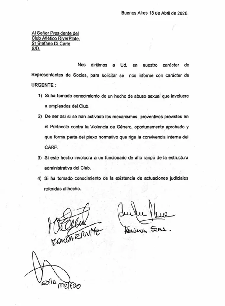 En paralelo, el 13 de abril, representantes de socios del club elevaron una nota al presidente Stefano Di Carlo para solicitar, con carácter urgente, precisiones sobre si la dirigencia tomó conocimiento del hecho denunciado y si involucra a personal de la institución.