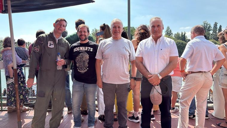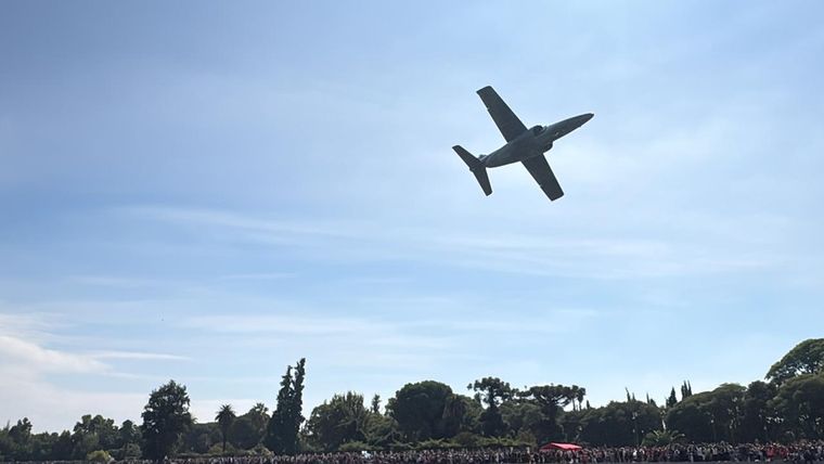 Uno de los momentos más esperados de la jornada fue el show aéreo, que incluyó la participación de helicópteros Lama y aviones de combate IA-63 Pampa, que realizaron vuelos de demostración y distintas maniobras sobre el lago del Parque General San Martín.