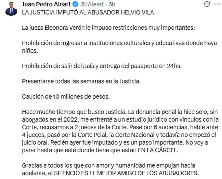 “No voy a parar hasta que esté donde tiene que estar: EN LA CÁRCEL”, agregó Aleart. Y concluyó: “Gracias a todos los que con amor y humanidad me empujan hacia adelante, el SILENCIO ES EL MEJOR AMIGO DE LOS ABUSADORES”.