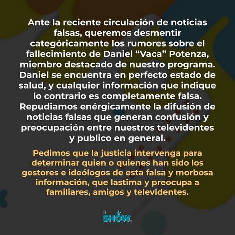Daniel Rodolfo Potenza, conocido popularmente como “La Vaca” Potenza, es periodista y panelista del programa "El Show del Lagarto" por la pantalla de Canal El Doce. La medida, confirmada por la Fiscalía de Cibercrimen a cargo de Franco Pilnik, constituye un precedente relevante contra la desinformación deliberada.
