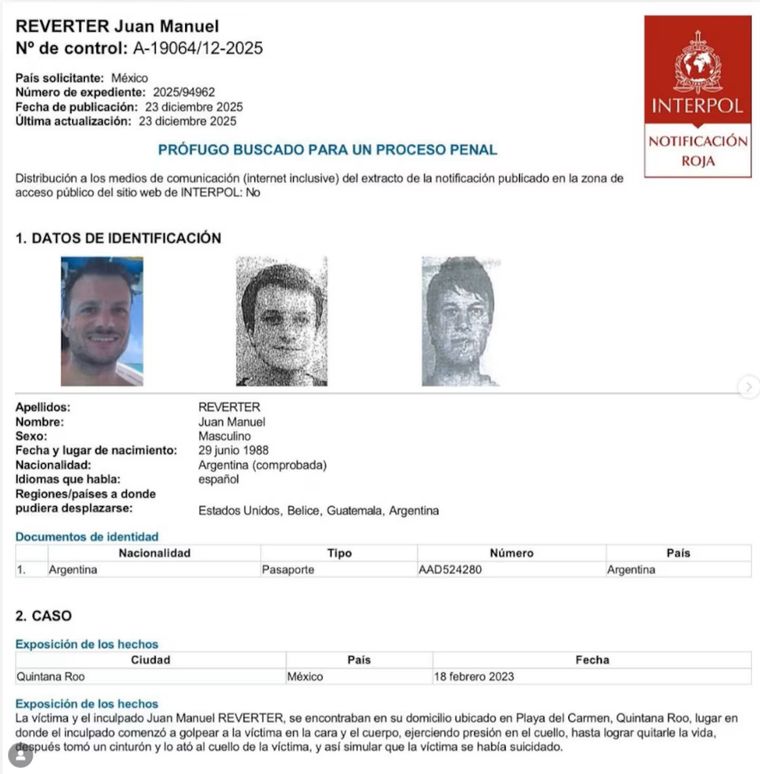 El Juzgado Federal de Viedma dispuso la detención de Reverter tras un pedido formal de la Fiscalía de México y la activación de una alerta roja de Interpol, lo que habilita su búsqueda a nivel mundial con fines de extradición. La resolución fue firmada el 6 de enero de 2026 por el juez federal de garantías Ezequiel Humberto Andreani, quien ordenó su arresto “en el lugar en que se encuentre” para avanzar con su traslado a territorio mexicano.