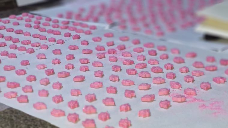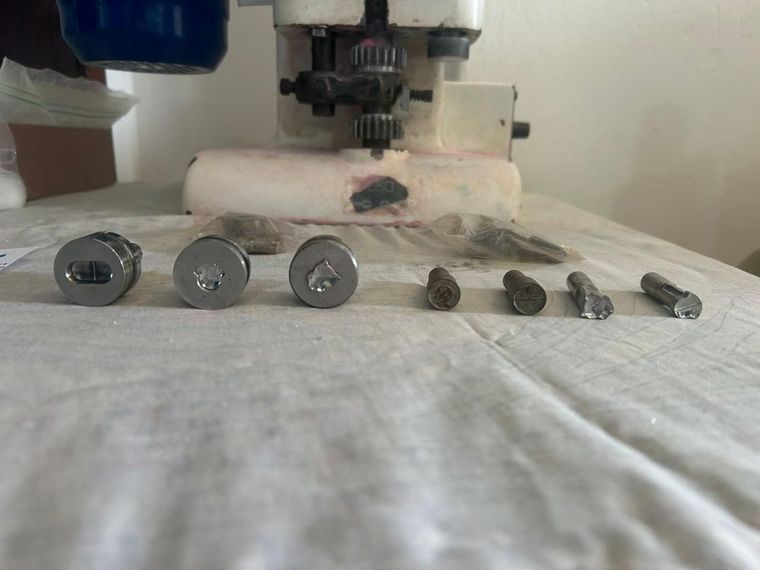 En el lugar se hallaron cinco juegos adicionales de cuños con distintos diseños, setenta y cinco frascos de colorantes de diversas marcas, siete recipientes plásticos con sustancias en polvo, y doce frascos más con componentes como lactosa monohidrato, acetona técnica, isopropanol y otras sustancias aún no identificadas.