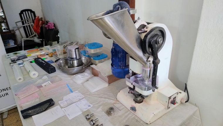 También se encontraron herramientas de fraccionamiento, como cucharas, pinceles y bolsas, así como cuatro balanzas de precisión, agendas con anotaciones y documentos relevantes para la causa. Se incautaron noventa pastillas ya fraccionadas, una sustancia violeta en proceso de elaboración, estearato de magnesio, alcohol polivinílico de alta viscosidad y maicena.