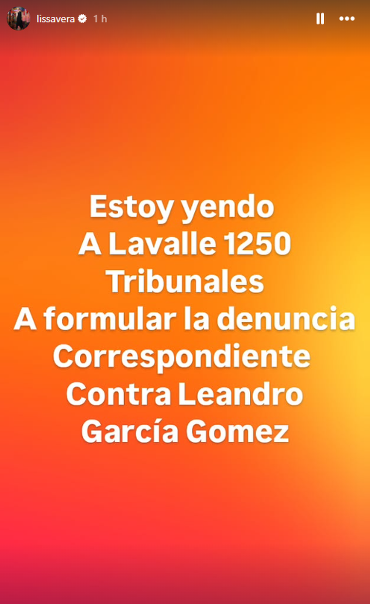 Recientemente, luego de que la propia Lourdes anunciara que se encuentra bien, Lissa volvió a subir otra historia asegurando que se encontraba en camino a “Lavalle 1250, Tribunales, para formular la denuncia correspondiente contra Leandro García Gómez”.