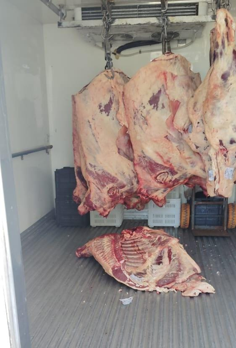 Carne de vaca en el piso de un camión en Guaymallén