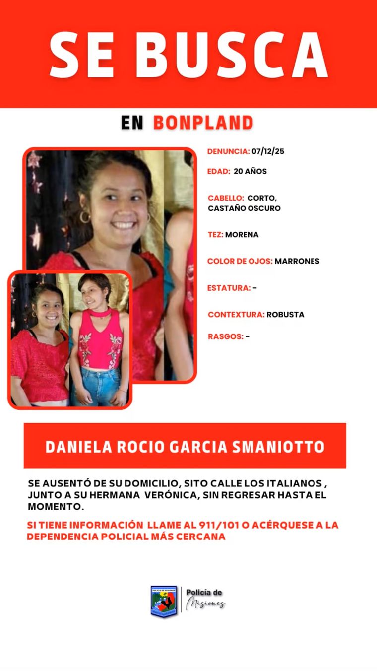 La provincia de Misiones se encuentra en alerta por la misteriosa desaparición de dos hermanas, Daniela Rocío y Verónica Itatí García Smaniotto, quienes salieron de su casa el domingo y desde entonces nada se sabe de ellas. Su madre, Magdalena A., de 36 años, radicó la denuncia en la Comisaría de Bonpland luego de que las jóvenes no regresaran al hogar familiar ubicado en calle Los Italianos.