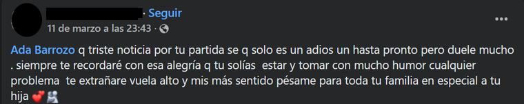 Una amiga de la fallecida escribió en sus redes sociales: "Qué triste noticia por tu partida. Sé que solo es un adiós, un hasta pronto, pero duele mucho. Siempre te recordaré con esa alegría que tú solías tener y tomar con mucho humor cualquier problema. Te extrañaré, vuela alto y mi más sentido pésame para toda tu familia, en especial a tu hija".