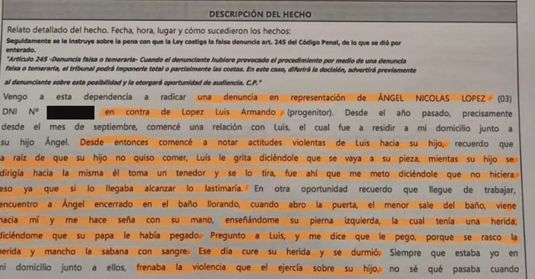 La denuncia profundizó y explicó: "Recuerdo que a raíz de que su hijo no quiso comer, Luis le grita diciéndole que se vaya a su pieza, mientras su hijo se dirigía hacia la misma, él toma un tenedor y se lo tira. Fue ahí que me meto diciéndole que no hiciera eso, ya que si lo llegaba alcanzar, lo lastimaría. En otra oportunidad recuerdo que llegué de trabajar, encuentro a Ángel encerrado en el baño llorando; cuando abro la puerta, el menor sale del baño, viene hacia mí y me hace seña con su mano enseñándome su pierna izquierda, la cual tenía una herida, diciéndome que su papá le había pegado".