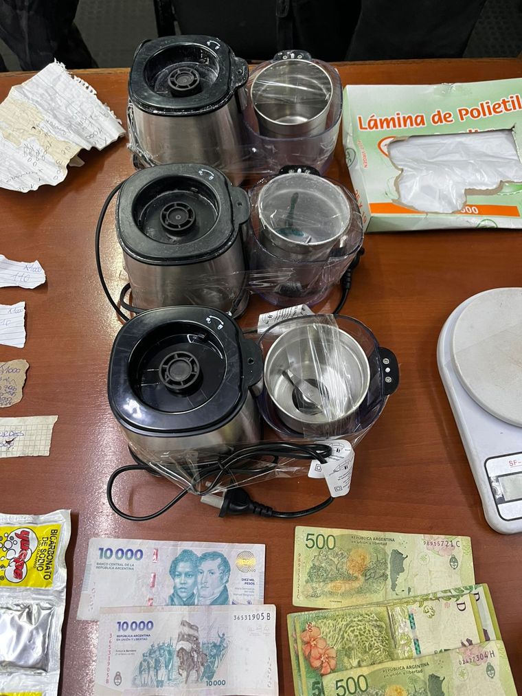 Horas después, se concretó un segundo allanamiento en otra vivienda de la misma manzana, donde los detectives dieron con elementos utilizados para el procesamiento y fraccionamiento de la cocaína: tres multiprocesadoras con restos de la citada sustancia, una balanza digital, bolsas de nailon, láminas de polietileno, tijeras y documentación de interés para la causa.