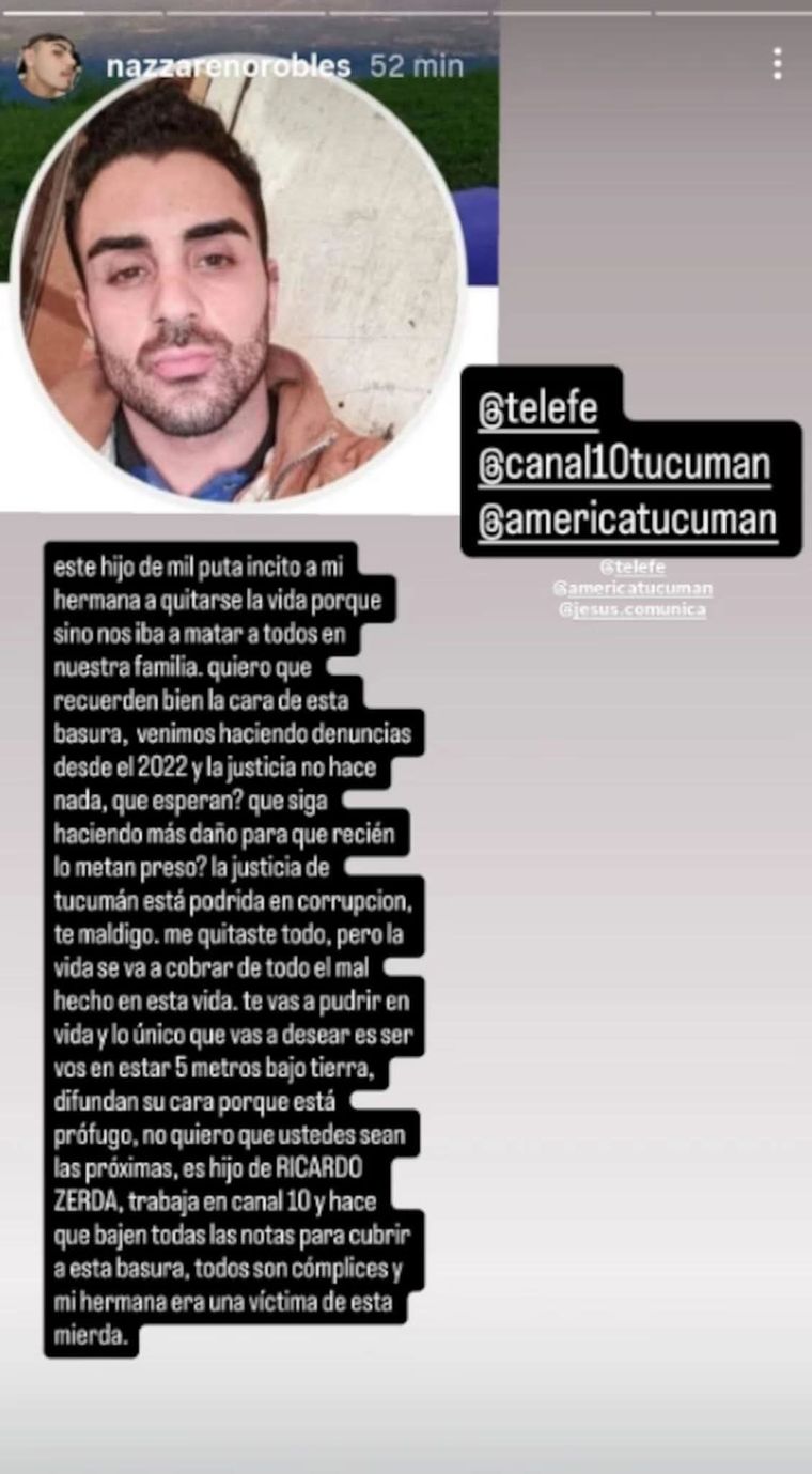 El abogado de la familia Robles, Augusto Avellaneda, señaló que existieron episodio de violencia. “En 2022 ella lo denunció por violencia de género. El fiscal Augusto Zapata le formuló cargos y dictó medidas de protección que fueron incumplidas”, detalló, en diálogo con Canal 10 de Tucumán. Sin embargo, en aquella ocasión, Zerda no fue detenido ya que “la Justicia entendió que era suficiente con un apercibimiento y una advertencia”.