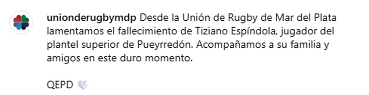 El rugbier de 25 años formaba parte del plantel superior de Pueyrredón de Mar del Plata. “Desde la Unión de Rugby de Mar del Plata lamentamos el fallecimiento de Tizziano Espíndola, jugador del plantel superior de Pueyrredon. Acompañamos a su familia y amigos en este duro momento”, publicó el club en sus redes sociales. A su vez, suspendieron todas las actividades.