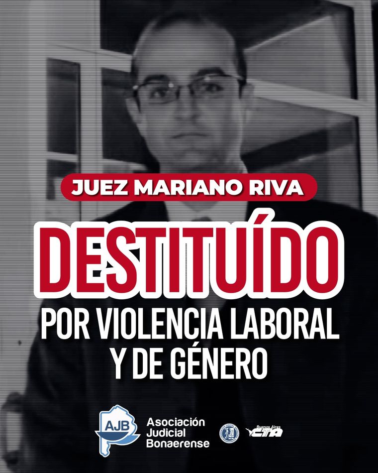 X - @dipbonaerensesEl miércoles, el Jurado de Enjuiciamiento de Magistrados y Funcionarios de la provincia de Buenos Aires destituyó al juez Mariano José Riva, quien había sido denunciado por maltrato, acoso sexual y abuso de poder. Cabe destacar que el juez que estaba a cargo del Tribunal de Trabajo N°4 de Mar del Plata estaba suspendido desde febrero de 2024.