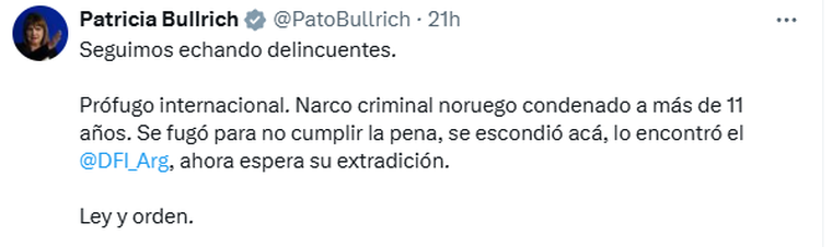 En su cuenta oficial de X, la ministra de Seguridad de la Nación, Patricia Bullrich celebró la captura del noruego en el barrio de Palermo. “Seguimos echando delincuentes. Prófugo internacional. Narco criminal noruego condenado a más de 11 años. Se fugó para no cumplir la pena, se escondió acá, lo encontró el DFI, ahora espera su extradición. Ley y orden”, expresó la funcionaria.