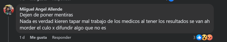 "Dejen de poner mentiras", inició el descargo del hoy imputado, y continuó: "Nada es verdad, quieren tapar el mal trabajo de los médicos. Al tener los resultados (forenses) se van a morder el culo por difundir algo que no es (sic)", apuntó en su primer mensaje.