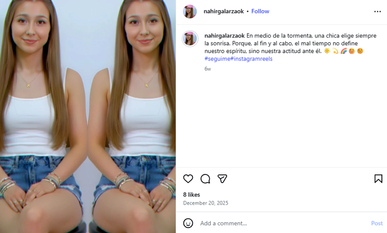 Por otro lado, la presentación de uno de los perfiles falsos dice: “Si va pasar algo conmigo, quiero que sea en libertad y afuera”. Dicho perfil cuenta con una serie de fotos de Nahir Galarza que fueron modificadas con IA. “En medio de la tormenta, una chica elige siempre la sonrisa. Porque, al fin y al cabo, el mal tiempo no define nuestro espíritu, sino nuestra actitud ante él”, se lee en una de las publicaciones.