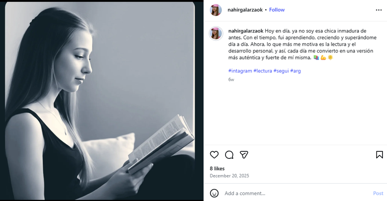 “Hoy en día, ya no soy esa chica inmadura de antes. Con el tiempo, fui aprendiendo, creciendo y superándome día a día. Ahora, lo que más me motiva es la lectura y el desarrollo personal, y así, cada día me convierto en una versión más auténtica y fuerte de mí misma”, dice otro de los posteos de Instagram.