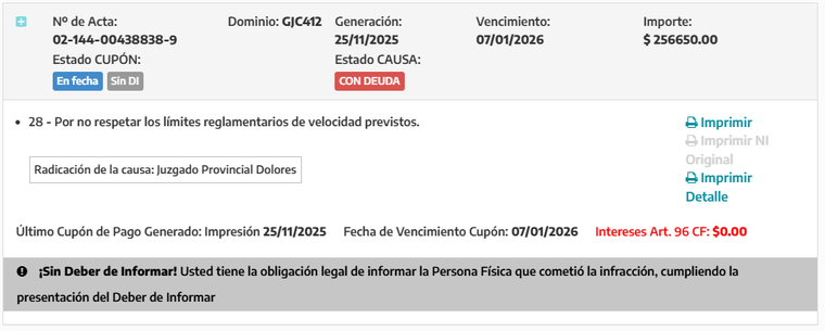 En las últimas se conoció un nuevo dato sobre el micro de la empresa Turismo New Bus. Según el sitio web de la Provincia de Buenos Aires, el colectivo, con patente GJC412, acumulaba una deuda de 256.650 pesos por una infracción por exceso de velocidad cometida el 8 de mayo de este año.