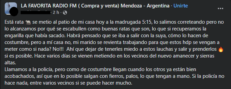 Este mensaje fue publicado en un grupo de vecinos de la zona del oeste capitalino, a ellos fue dirigido el final de este escrito. Su vecina escribió: "Llamamos a la policía, pero como de costumbre llegan cuando los otros ya están bien acobachados, así que en lo posible salgan con fierros, palos, lo que tengan a mano. Si la policía no hace nada, entre varios vecinos si se puede hacer mucho".
