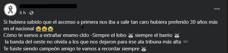 Otro de sus amigos, también hincha del club mendocino, escribió que "si hubiera sabido que el ascenso a primera nos iba a salir tan caro, hubiera preferido 30 años más en el nacional".