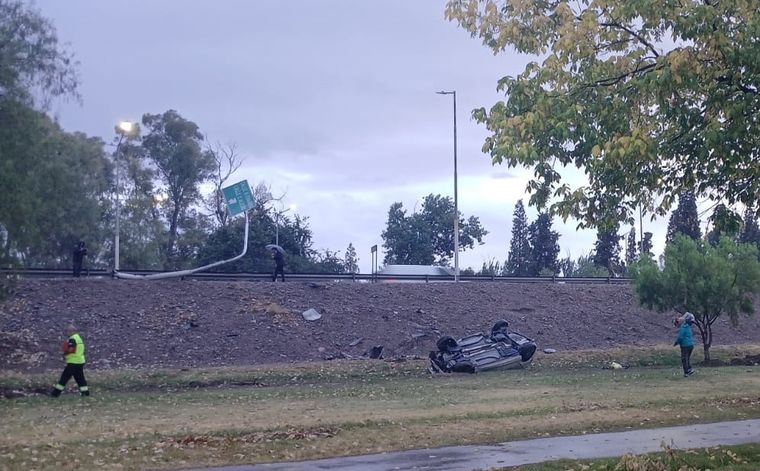 Volcó y desbarrancó en el Acceso Este tras chocar contra un cartel