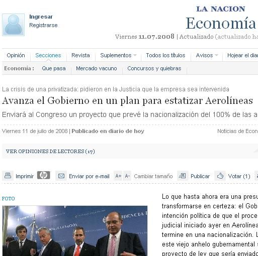 La Nación afirmó que “lo que hasta ahora era una presunción comenzó a transformarse en certeza: el Gobierno tiene la intención política de que el proceso de intervención judicial iniciado ayer en Aerolíneas Argentinas termine en una nacionalización”.