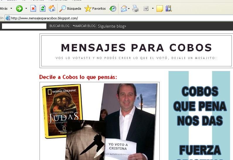 Se trata nada menos que del Blog MensajesParaCobos.blogspot.com. Allí corre la adrenalina K, bajo un título que, de entrada, se reserva el derecho de admisión para los mensajes que lleguen hasta allí: “Cobos que pena nos das. Fuerza Cristina te bancamos”, rezan las palabras más visibles del portal.