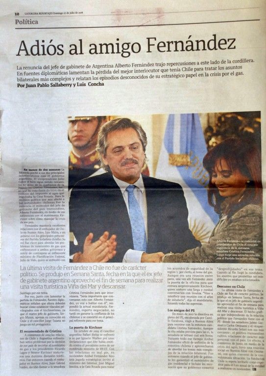 Con respecto a Fernández, el diario consideró que “la decisión política que más afectó a las autoridades chilenas fue la renuncia el miércoles del jefe de Gabinete, en medio de diferencias con el matrimonio Kirchner en torno a cómo manejar la crisis de ese país”.