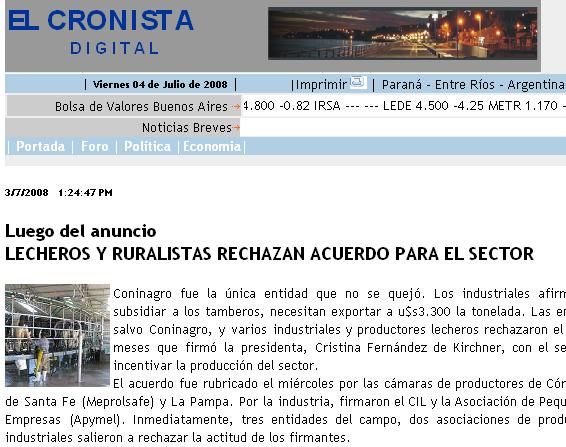 Más adelante, abundó en la grieta producida en el sector, señalando que “los industriales afirmaron también que, para pagar 95 centavos por litro de leche al productor, la exportación debería tener un precio de corte de u$s3.300 por tonelada”. Y, además, “se quejaron de que deberán financiar los subsidios al productor, que antes hacía efectuaba directamente el Estado, apenas compran el litro de leche”.