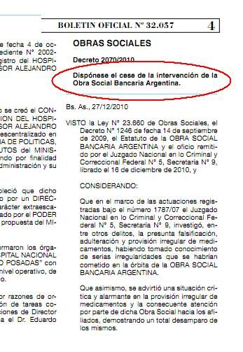 Tal vez por ello es que, finalmente, el oficialismo decidió dar fin “de golpe y porrazo” a la intervención de la Obra Social Bancaria que venía desarrollando Pedro Ferrara desde el 14 de septiembre de 2009. Lo hizo esta misma mañana, a través del decreto 2070/10.