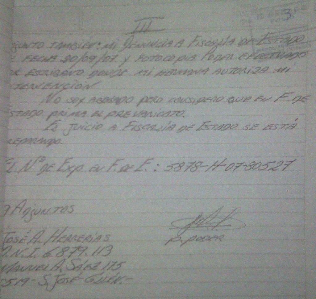 “Decían que protegían mis derechos y hacían lo contrario. Lo hicieron por tres años. El 20/09/07 hice mi denuncia a fiscalía y el 7/12/09 lo pasa a archivo. Se tomaron tres años para decir: ‘fiscalía de Estado no tiene sustento técnico que avale la posición jurídica del Sr. Herrerías’.”, asegura el escrito de marras.