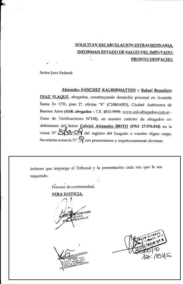 Ayer a las 13.15 horas, Brito presentó ante el Juzgado Federal N°5 un oportuno pedido de excarcelación. Allí, el empresario hace hincapié en que padece de diabetes y que no ostenta antecedente judicial alguno, lo cual lo libera de toda peligrosidad para poder estar libre.