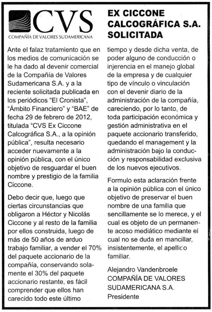 Negó haber firmado la solicitada publicada en algunos diarios donde aparecía como el dueño de The Old Fund y que había contratado a Vandenbroele. Luego de la solicitada fue insultado por su cuñada Olga Ciccone y después habló con Lorena, su mujer, quien le dijo que su padre lo acusaba de ser un hijo de puta y, además, de robarse la empresa familiar. Su suegro también lo acusaba de robarse la empresa y prometió meterlo preso. Luego hubo otra reunión familiar en el country Mayling donde entendieron la situación.