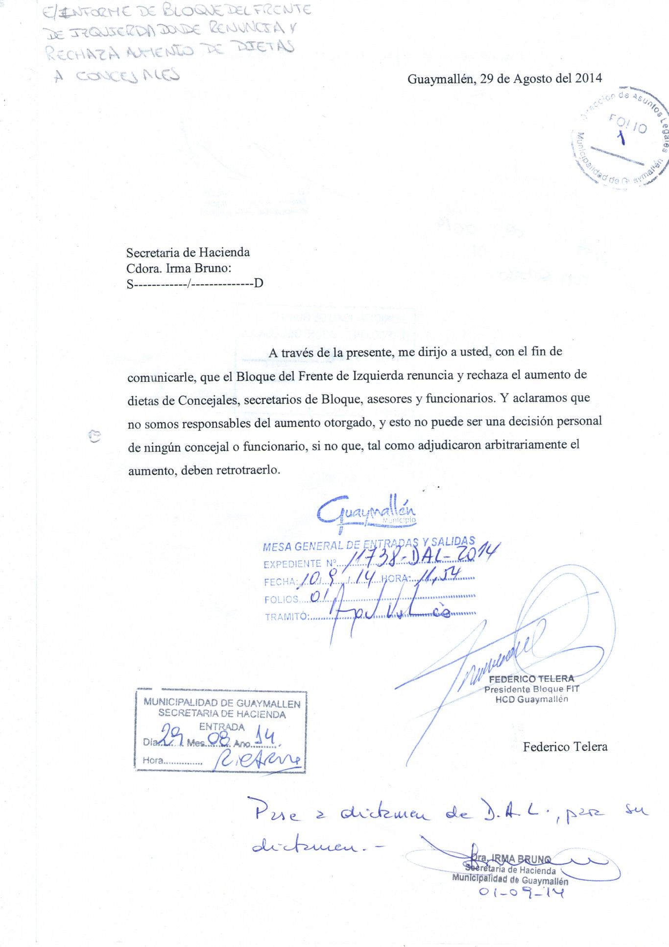 De acuerdo con los datos aportados por Telera, el FIT renunciaba a los aumentos de julio y agosto de 2014, correspondientes a $23.000, y pedían se "reconsiderara el valor resultante del VRS (Valor de Referencia Salarial), a los efectos de adecuar los salarios de los concejales y funcionarios municipales, a una pauta acorde a las funciones y a lo que la realidad económica de nuestra sociedad indica".