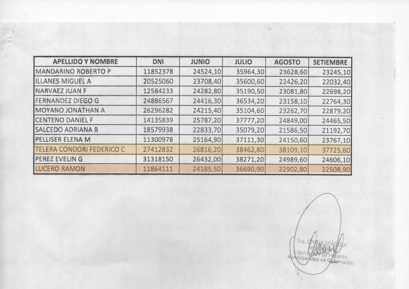 Pese a todos los datos aportados por el FIT, Lucero presentó la planilla de dietas en la que se observa que Telera continúa cobrando con aumentos: