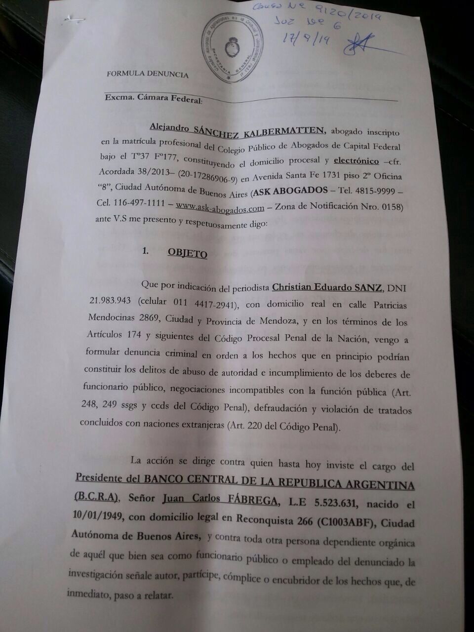 Según el escrito, la acción se dirige "contra quien hasta hoy inviste el cargo del Presidente del Banco Central de la República Argentina (B.C.R.A), Señor Juan Carlos Fábrega, L.E 5.523.631, nacido el 10/01/1949, con domicilio legal en Reconquista 266 (C1003ABF), Ciudad Autónoma de Buenos Aires, y contra toda otra persona dependiente orgánica de aquél que bien sea como funcionario público o empleado del denunciado la investigación señale autor, partícipe, cómplice o encubridor de los hechos".